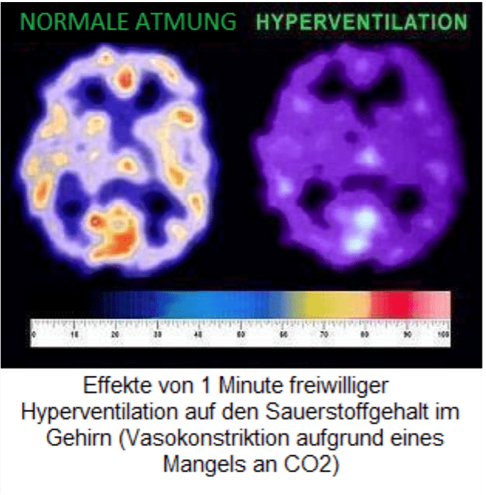 Schon eine kurzfristige heftige Hyperventilation legt die Stoffwechselaktivität des Gehirns praktisch lahm. Nachgewiesen im PET ( Positronen-Emissions-Tomogramm)